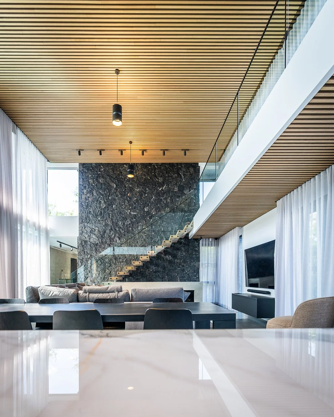 A stair detailed in stone and timber anchors the central double-height space, enhancing the home’s sense of openness while providing a seamless connection between the shared living areas below and the private bedrooms above.
